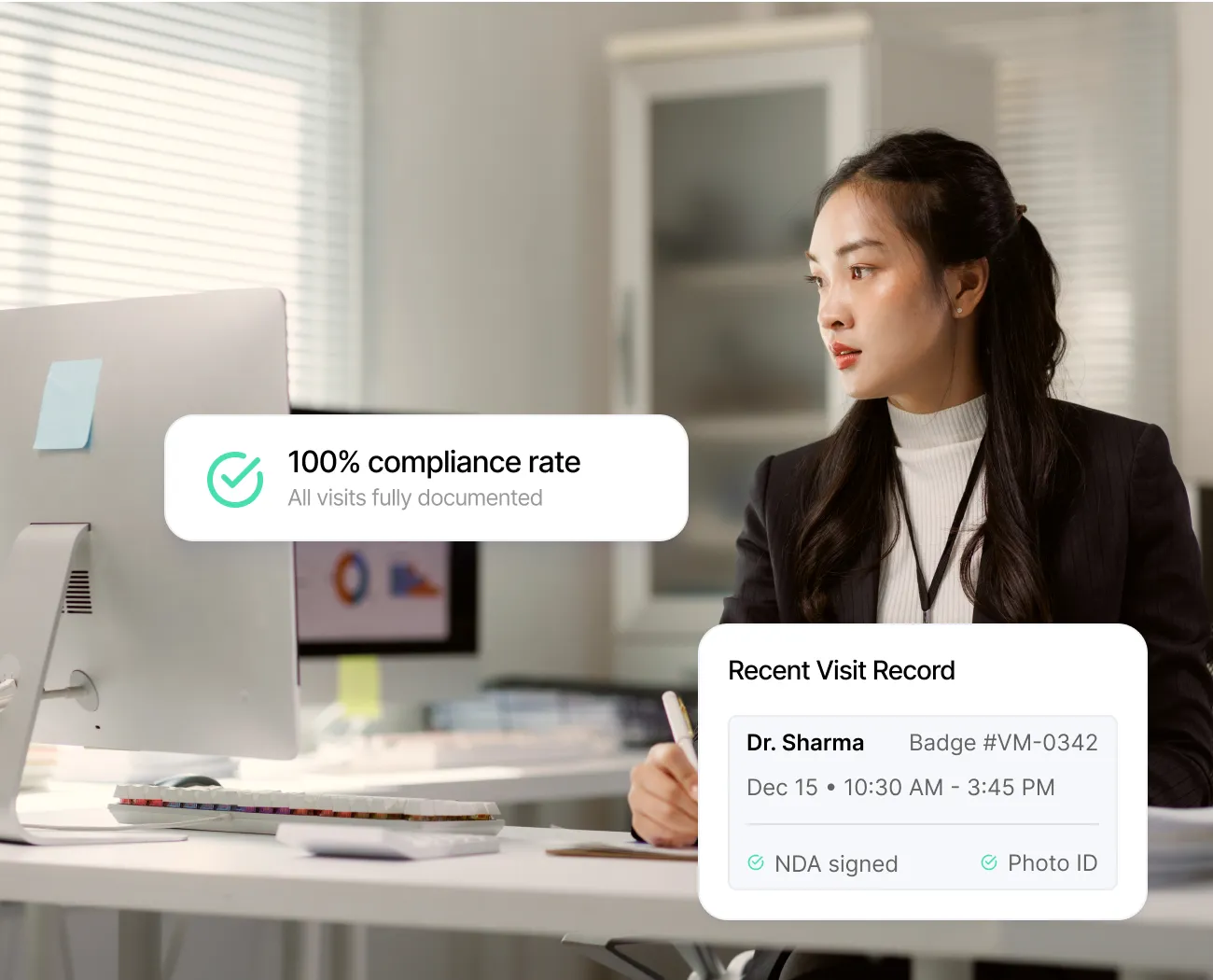 Your compliance team stays audit-ready at all times. Every visit automatically creates its own documentation, from check-in details to signed agreements, organized and exportable whenever you need it.