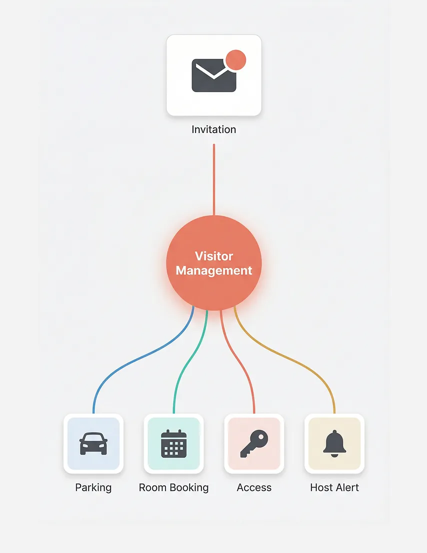 One invitation coordinates everything the visit needs, from room bookings and parking to access and host alerts.